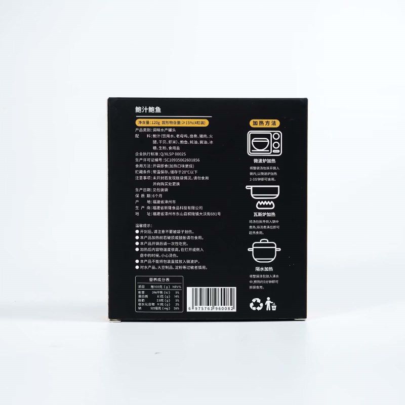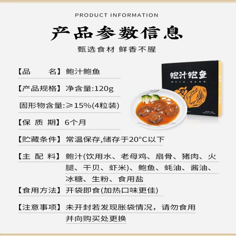 成分: 鲍鱼汁(饮用水、老母鸡、猪粉丝骨、猪肉、金华火腿、鲍鱼干、干贝、虾米)、鲍鱼、蚝油、酱油、冰糖、淀粉、食用盐