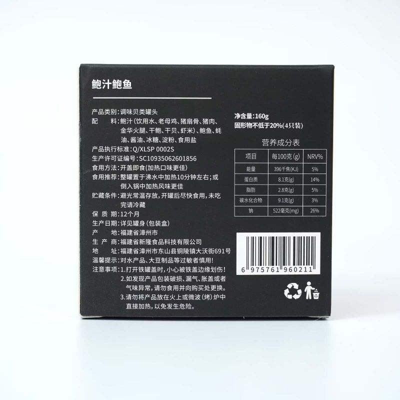 成分: 鲍鱼汁(饮用水、老母鸡、猪粉丝骨、猪肉、金华火腿、鲍鱼干、干贝、虾米)、鲍鱼、蚝油、酱油、冰糖、淀粉、食用盐