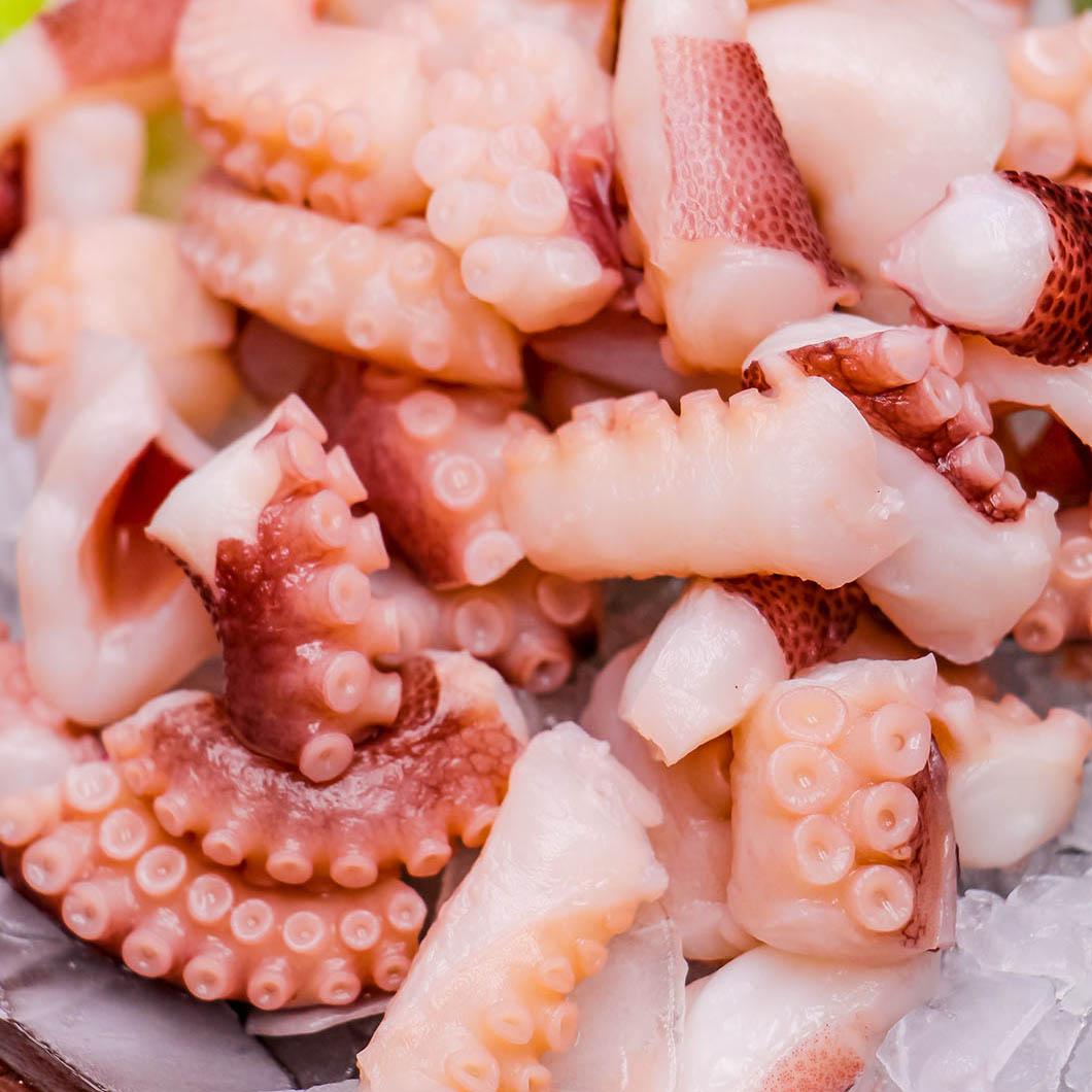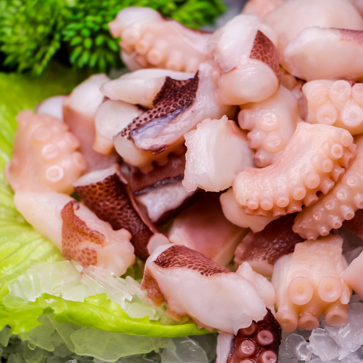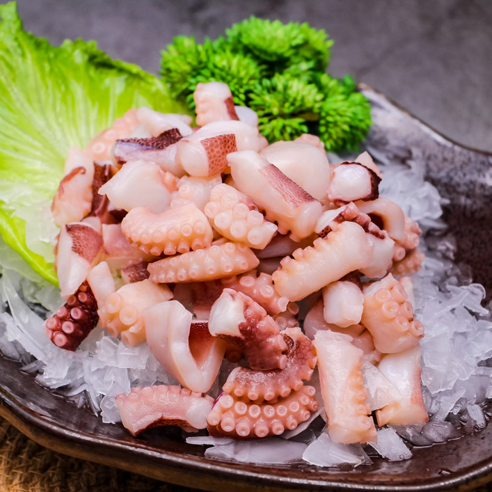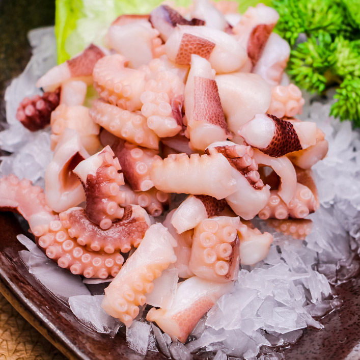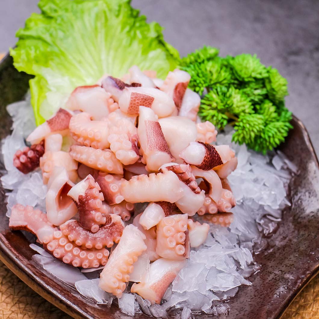 寿司和生鱼片: 章鱼丁是寿司和生鱼片中常见的食材之一。章鱼切成小块后,可以用来制作寿司卷、生鱼片拼盘,为日本料理增添海鲜风味。