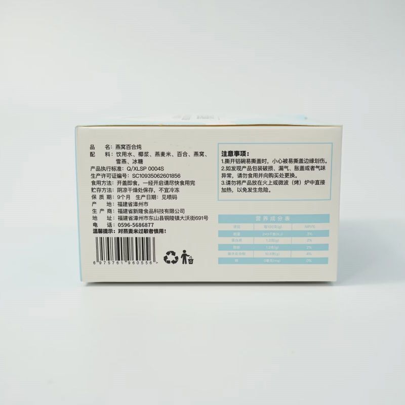 成分: 饮用水、椰奶、燕麦片、百合、燕窝、雪燕、冰糖